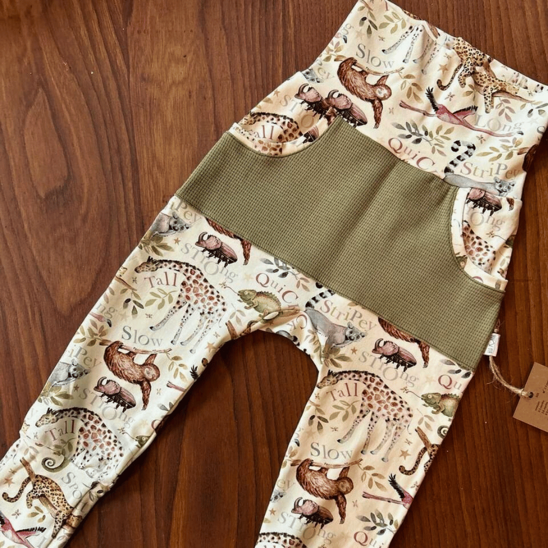 Introducing our adorable Handmade Kids Clothing: Grow with Me Pants! Crafted with love and attention to detail, these pants are designed to accompany your little one through every growth spurt and milestone. Made from soft, stretchy cotton and featuring a charming animal print, these pants are as comfortable as they are cute.